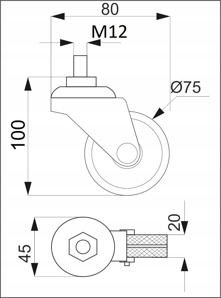 KÓŁKO OBROTOWE GUMOWE fi 75 mm czarne z gwintem M12