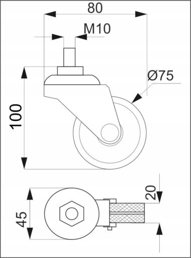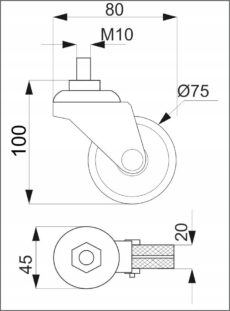 KÓŁKO OBROTOWE GUMOWE fi 75 mm czarne z gwintem M10 DO RURY AKS